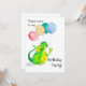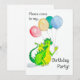 Um convite de aniversário com um dragão amarelo e verde-gelado com balões, de uma ilustração de aquarela de Judy Adamson.