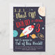 Convide seus amigos para uma festa que estará fora deste mundo com este adorável convite de aniversário para o tema espacial apresentando um foguete que explora o espaço entre planetas, estrelas e galáxias!