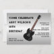 Convite de aniversário com tema musical para a festa do garoto adolescente. Fundo das cinzas prateadas com letra preta impressa casual. Uma imagem de guitarra solteiro enfeita a frente deste convite masculino. O reverso é preto sólido. Use para qualquer tipo de festa ou reunião para adolescentes.
