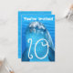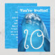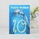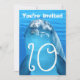 Convite de aniversário com tema de rosto de golfinho. Água azul e um grande golfinho sorridente é o design dos cartões destinados ao aniversário de uma criança. Texto "Você está convidado" com a idade em números grandes e ondulados na frente e mais texto para personalizar no verso. Cor azul água de verão com texto branco em letras onduladas para combinar com o tema aquático. Todas as informações do aniversário são adicionadas em forma de parágrafo com bastante espaço para todas as informações necessárias. Este design também funciona em cartões de outros tamanhos.