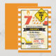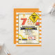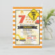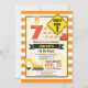 Convite de aniversário do garoto do tema da construção sobre fundo listrado em laranja e branco. Personalize este bonitinho, convide com o nome do seu filho. Possui escavador amarelo, placa de zona de festas de construção, cone cor de laranja, e 7, vela de sétimo aniversário do que pode ser personalizada. Perfeito para o primeiro bebê, 1rua, aniversário, criança, crianças pequenas, ou crianças mais velhas. As cores incluem laranja, amarelo, cinza, preto e branco.