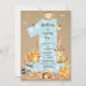O convite para o aniversário dos Garotos Grandes e Bonitos, com um grande número azul cercado por animais da floresta, coruja, guaxinim, raposa, veado, alce e ouriço, é colocado sobre um fundo de kraft popular.