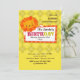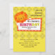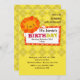 Um leão giro segura um letreiro com a palavra "Aniversário" pré impressa. O fundo é um padrão amarelo e de ouro. Doce por qualquer celebração juvenil.