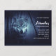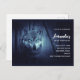 Cartão postal de convite de aniversário com uma imagem de um lobo místico mágico em pé em uma floresta com neve suave caindo ao redor.