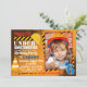 Local de construção com fundo sujo, chapéu de duro, cone e fita de construção. design da placa de convite de aniversário. 6 anos.