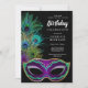 Este convite deslumbrante inclui penas de pavão cintilantes com uma máscara festiva do Mardi Gras.