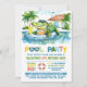 Apresentando nosso Convite de aniversário para o Partido da Piscina Crocodilo, disponível em formato impresso e eletrônico, pronto para download instantâneo. Este convite mostra um crocodilo brincalhão desfrutando de uma festa de piscina, deitado sobre um colchão inflável com limonada e bolo. O pano de fundo apresenta uma casa e palmeiras, acrescentando um toque exótico. Perfeito para festas de aniversário infantis e comemorações de verão ao ar livre! Além do seu encanto visual, este convite oferece personalização perfeita, permitindo texto personalizado, fontes, tamanhos e cores.