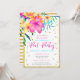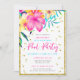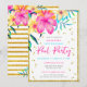 Faça um salto tropical com este Convite de festas floral colorido! Possui um hibisco tropical brilhante e flores insulares junto com bordas de confete e bordas brilhantes. Personalize facilmente as suas informações de eventos. O dorso tem flores e listras de ouro.