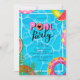 "Faça um salto com este vibrante e moderno Convite de Aniversário do Partido da Piscina! Apresentando gráficos claros e azuis, letras infláveis tocáveis e soletrando 'PISCINA', e sotaques flutuantes divertidos como fatias de melancia e anéis de rosquinha, esta design é perfeita para uma celebração animada.