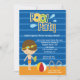 Splish Splash estamos tendo um baixo!Comece a comemorar com este convite adorável. Perfeito para a piscina daquele aniversariante. Tem um fundo azul brilhante com listras azuis finas e claras. No fundo do convite está um terreno laranja com uma bola de praia colorida deitada ali ao lado de uma escada de piscina. Ao lado disso está um rapaz adorável de maiô laranja com óculos na cabeça. No topo do convite diz "piscina" e os O's são tubos. Personalize com as informações de seu partido. Veja os muitos outros produtos e designs nesta linha de piscina.