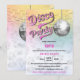 © 2023 Socialite Design Inc. & LICENSORS. Celebre uma festa de aniversário de discoteca convidando os convidados com este convite de aniversário divertido e retrô. As cores são a cor prateada, branca, rosa quente, brilho e cinzas. O design incorpora uma bola prateada de disco e luzes de cordas brancas, com bokeh como fundo.