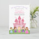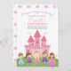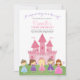 Todo o texto é editável neste convite para o tema Princesa. Possui um castelo desenhado pela mão rosa, 5 princesas e fundo de conto de fadas. Perfeito para qualquer celebração do tema da Princesa.