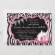 Design de convite de aniversário de festas de chic e spa selvagem com chetah e impressões de animais de zebra, faixa de bunting e esmalte de unha. As cores são pinks, preto e branco.