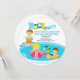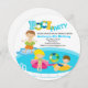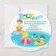 Comece a comemorar com este convite adorável. Perfeito para a piscina daquele aniversariante. Tem um fundo branco. Há uma grande piscina de natação com um adorável, bonitinho ao seu lado numa poça de água. Ele tem cabelo castanho e um tubo em torno da cintura. Na piscina está uma linda garota loira flutuando numa balsa. Ao lado dela está um garoto de cabelo castanho flutuando em um tubo na piscina. No topo do convite está a palavra piscina. Os dois O's na piscina são tubos coloridos. Veja os muitos outros produtos e designs nesta linha da piscina. ©JW Ilustrations