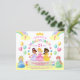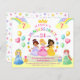 Um tema da princesa, Convite de aniversário infantil. Em fundo branco, princesas em vestidos azuis, roxos, cor-de-rosa, amarelos e verdes são vistas ao redor de um pódio com flores, balões, bolo e presentes. O texto da tipografia diz o nome da sua criança, a festa princesa, com uma coroa decorativa no topo. A idade da criança é escrita em duas nuvens flanqueadas por arco-íris. Personalize adicionando seu evento de cheio e os detalhes de contato.