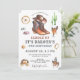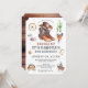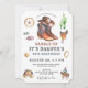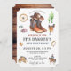 Um convite de 4 anos de cowboy selvagem, giro e chorudo, em terracotta, castanhos e blues para um garoto, com a cidade ocidental, barata de cowboy, lasso, e cowboy em cavalo. Tudo o que um cowboy precisa. É o primeiro rodeio dele! Padrão de madeira rústica escura na parte de trás do convite. Você pode personalizar isso para qualquer idade!