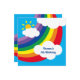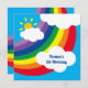 Um maravilhoso padrão temático do tempo incluindo nuvens brancas fluffy, sol e um grande arco-íris. O dorso também está coberto de um arco-íris.