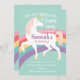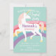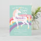 Jogue uma festa mágica para a próxima festa de aniversário da sua garotinha este adorável convite de unicórnio. Com a inscrição à mão e um unicórnio desenhado à mão sobre um arco-íris colorido e fundo verde de menta.
