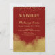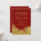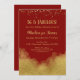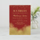 Um convite elegante de aniversário vermelho e dourado com poeira de confete de ouro no topo e bico de ouro no fundo.