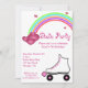 Um belo convite de aniversário perfeito para qualquer festa de patins. Apresenta um fundo branco com um arco-íris giro no topo. Um skate de desenho animado está embaixo. O texto é personalizável em rosa.