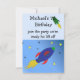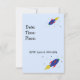 Um foguete espacial brilhante em azul, vermelho e verde a explodir para a lua. Fundo azul com um céu estrelado. Personalize com todas as informações do seu aniversário de crianças conforme desejado.