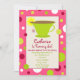 Um convite de aniversário para uma festa de chá com um esquema de cores rosa e verde brilhantes. Ilustração de uma equipe verde com fatia de limão no topo. O fundo de ambos os lados é rosa quente. A frente apresenta bolinhas em vermelho, branco e verde. Personalize o texto com detalhes da sua ocasião.