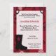 Convites de aniversário vermelho para cowboys com fundo de bandana vermelha. Os convites têm uma bota preta com uma estrela vermelha e duas ferraduras. Tema ocidental só para rapazes. Personalize com os detalhes do seu partido.