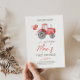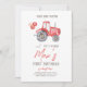 Este convite de aniversário apresenta um trator vermelho giro com balões coloridos à deriva, e o nome exibido em letras grandes e alegres. É tudo sobre diversão e entusiasmo para a próxima festa de aniversário de tratores do campo!