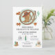 Um convite para o chá de fraldas do cowboy ocidental, giro e caprichoso, em terracotta, castanhos e azuis, com engrenagens ocidentais de cowboy e animais de fazenda. Saddle, steer, cavalos, cacto, sela e lasso. A parte de trás do convite tem um efeito de madeira de celeiro de penas leves.