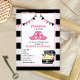 Um convite festa de aniversario de meninas com um tema pirata. O Conite tem uma ilustração do chapéu de um pirata rosa no topo e do tesouro de moedas, joias e espadas no fundo. Convide também recursos de montagem no topo e um fundo distribuído. Personalize o texto com detalhes da sua ocasião.