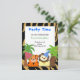 O mais bonito tigre e leão vestindo chapéus coloridos acenam este convite de aniversário da selva divertida. Palmeiras soprando ao fundo. Uma fronteira de impressão de pelo de tigre. Personalize com todas as suas informações pessoais conforme desejado. Um convite para zoológico divertido.