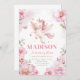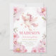 O convite de aniversário do Unicórnio é perfeito para a festa de aniversário de uma princesa. Tem borboletas cor-de-rosa e flores cor-de-rosa com estilo aquarela. Perfeito para uma festa de aniversário da princesa de fada de menina.