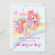 Transforme o aniversário do seu filho num conto de fadas com este convite de unicórnio pastel com um castelo mágico de arco-íris. (Trabalho de arte Gerado por AI)