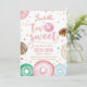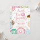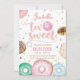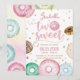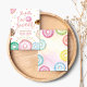 O design apresenta donuts com cores vibrantes com confeitos e confetes em cores pastéis. É um convite perfeito para o 2º aniversário de uma menina que terá uma festa temática de donut ou doces.