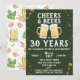 Canecas de cerveja pintadas no fundo da verde floresta, "ELOGIOS & CERVEJAS", convite de aniversário. Teste padrão do estilo do bar em características, em saltos, no trigo, no vidro de cerveja, na caneca de cerveja e em pretzeis traseiros. A cor e o estilo da pia batismal podem ser personalizados.