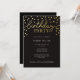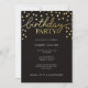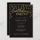 Um sofisticado convite de aniversário com "festa de aniversário" e confete redondo em folha de ouro falsa sobre um simples fundo preto. Devido às diferenças nos monitores e nas configurações de exibição do dispositivo, as cores impressas podem variar ligeiramente do que você vê na tela. Obrigado por visitar Walt & Ellie