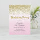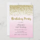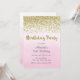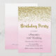 Convite de aniversário com design dourado falso e fundo de cor-de-água rosa ombre.
