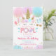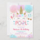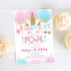 Este convite apresenta as ilustrações adoráveis de piscinas desenhadas à mão com um monocórnio e embelezamentos falhos de ouro.