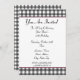 Um convite simples com um design gingham cinza carvão na parte superior e inferior da frente. Corte rosa e fonte em negrito de fita preta. Personalize com detalhes da sua ocasião. O lado oposto apresenta um design sólido com uma forma circular no meio, enquadrando o texto.