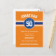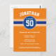 Listras azuis reais e um fundo laranja destacam este convite de aniversário temático esportivo. O design inclui um design de camiseta esportiva com uma área para destacar o nome e a idade do aniversariante.