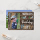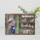 Um legal convite de aniversário externo. A frente tem uma cerca de madeira rústica com a mensagem "Festa de aniversário ao ar livre" Adicionar nome e foto. O verso é uma ilustração do exterior com árvores e grama. Personalização linha a linha.