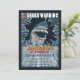 Terá uma festa de aniversário incrivelmente legal com este convite de aniversário de tubarões! Apresenta um ataque extremo de tubarões ao fundo azul-marinho escuro. Perfeito para qualquer criança que ama tubarões!