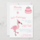 Um nono convite de aniversário giro e caprichoso com a ilustração de um flamingo rosa e um bolo de aniversário de dois níveis. O trabalho de arte está em um estilo kawaii e tem uma sensação feminina e bonito. Faça seu convite personalizado hoje mesmo!