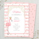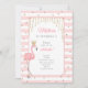 Trendy watercolor flamingo convite com listras brancas e cor-de-rosa com pontos de ouro e cortina. Que fofo!