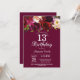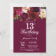 Convite de aniversário Floral de 13 Burgundy para Moça-Dama Teenage. Burgundy Red Festa de aniversário Convide. Flor Floral de Aquarela Burgundia. 13 15 de 16º 18º 20 21rua 30 de 40º 50º 80 de 60º 70 de 100º. Para mais personalização, clique no botão "Personalizar" e use nossa ferramenta de design para modificar este modelo.