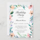 Bonito estrutura floral de cor d'água pastel, convite de aniversário. A placa apresenta flores e folhagem de jardim macios em tons de rosa, pêssego, roxo e verde, em um quadro bonito com coordenação do apoio floral.