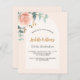 Um fundo de rosa bege com um arco. Decorado com flores rosa e douradas, flor de rosa e folhagens de eucalipto verde em aquarela. Personalize e adicione seu nome e detalhes da festa.