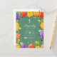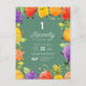 Este design faz parte da coleção de festa de aniversário infantil 'Frutas Dançantes'. Ele apresenta papelaria fofa com frutas tropicais em aquarela, como mamão, uvas, morangos, laranjas e abacaxis, juntamente com folhas e notas musicais. Perfeito para celebrações de aniversário de meninos ou meninas.