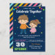 Incêndios para seus convidados com esta festa de aniversário gêmea convidando com um garoto fofo e uma garota com tipografia moderna contra um fundo azul. Basta adicionar os detalhes do seu evento neste modelo fácil de usar para torná-lo um convite de tipo único. Sacudir a placa para revelar um padrão colorido de listras na parte traseira da placa.