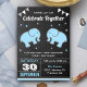 Encontrem seus hóspedes com esta festa de aniversário gêmea convidando com adoráveis elefantes com elementos vibrantes contra um fundo de quadro. Basta adicionar os detalhes do seu evento neste modelo fácil de usar para torná-lo um convite de tipo único. Sacudir a placa para revelar um padrão elegante de listras azuis e brancas na parte traseira da placa.